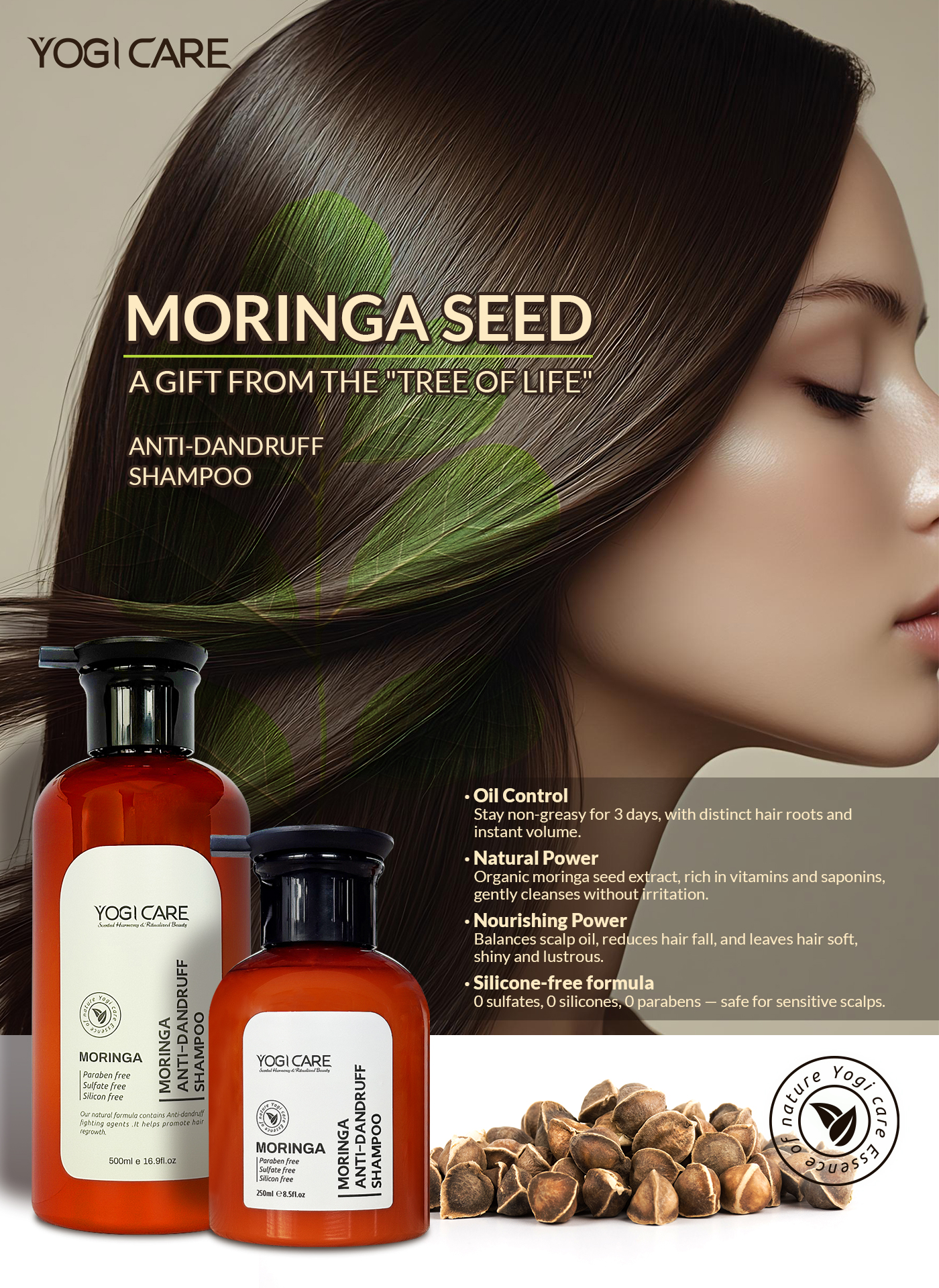 At YOGI, we believe that every strand of hair deserves to be treated with care and intention. Our custom Moringa Shampoo service allows you to design a formula that perfectly fits your hair type, lifestyle, and brand vision — powered by the natural strength of Moringa seed extract, also known as the “Miracle Tree.”