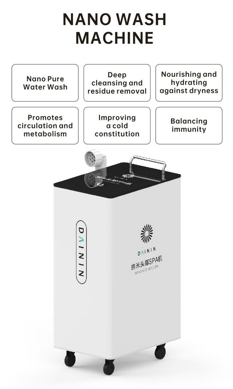 Durante el proceso de lavado de la máquina DʌININ Nano Scalp SPA, los iones negativos de oxígeno ingresan al sistema sanguíneo y linfático a través del cuero cabelludo y son transportados a todo el cuerpo, favoreciendo el metabolismo celular, activando la piel, favoreciendo la circulación sanguínea y mejorando la microcirculación; desintoxicación y esterilización a baja temperatura; eliminando la acumulación de radicales libres y retrasando el envejecimiento: equilibrando la inmunidad y activando la capacidad de autocuración; aliviando eficazmente el estrés nervioso y mejorando el sueño: logrando así los efectos de nutrir y rejuvenecer el rostro y la piel.