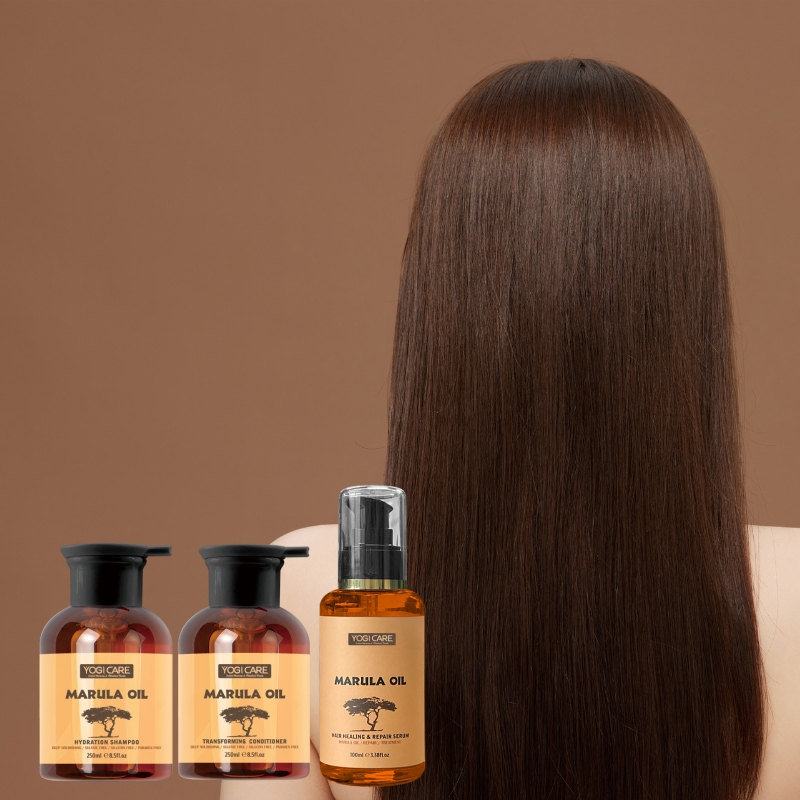 Cosechado del fruto de los árboles de Marula en el sur de África, el aceite de marula 100% natural contiene poderosos antioxidantes, ricos nutrientes y ácidos grasos para nutrir el cabello y estimular las raíces.