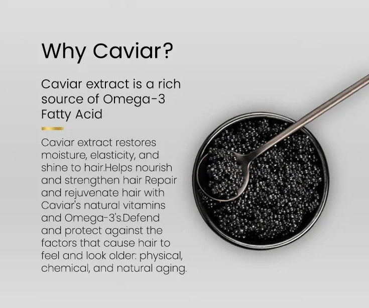 คาเวียร์ประกอบด้วยวิตามินหลายชนิด (เช่น วิตามินบี 12 วิตามินดี และวิตามินซี) และแร่ธาตุ (เช่น สังกะสี เหล็ก และแมกนีเซียม) ที่ช่วยบำรุงและบำรุงรักษาเส้นผม สุขภาพ. สารอาหารเหล่านี้ทำงานร่วมกันเพื่อปรับปรุงเนื้อสัมผัสของเส้นผม ลดการหลุดร่วงของเส้นผม และช่วยให้เส้นผมแข็งแรงและฟูมากขึ้น