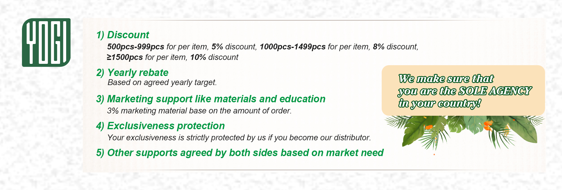 Siamo un'azienda molto potente di cosmetici e cura dei capelli e i nostri marchi sono ben noti nel Medio Oriente e nel Sud-Est asiatico. Ci auguriamo inoltre che sempre più persone si uniscano a YOGI e diventino nostri agenti.