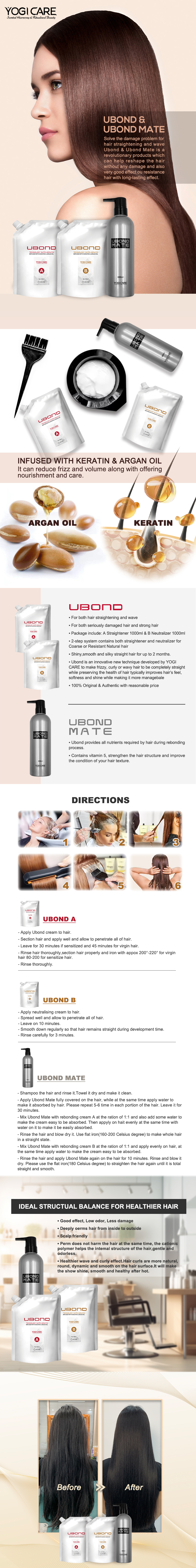 ▪Ubond is an innovative new technique developed by YOGI CARE to make frizzy,curly or wavy hair to be completely straight while preserving the health of hair typically improves hair’s feel,softness and shine while making it more managebale