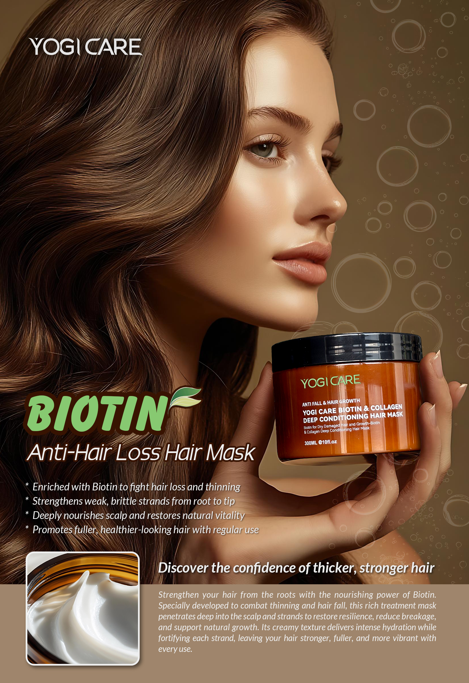 เมื่อพูดถึงเส้นผมที่แข็งแรงและสุขภาพดี ความชุ่มชื้นและความแข็งแรงคือสององค์ประกอบสำคัญที่สุด YOGI Customized Biotin Hydrating Anti-Hair Loss Mask* ออกแบบมาเพื่อตอบโจทย์ทั้งสองสิ่งนี้ ด้วยคุณค่าการบำรุงอันทรงพลังที่บำรุงหนังศีรษะอย่างล้ำลึก คืนความชุ่มชื้น และช่วยลดปัญหาผมร่วงที่เกิดจากความแห้งกร้าน อ่อนแอ หรือความเครียดในชีวิตประจำวัน
